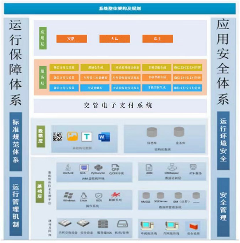 交管电子支付系统采用四层体系架构设计:应用层、服务层、数据层、和基础层。