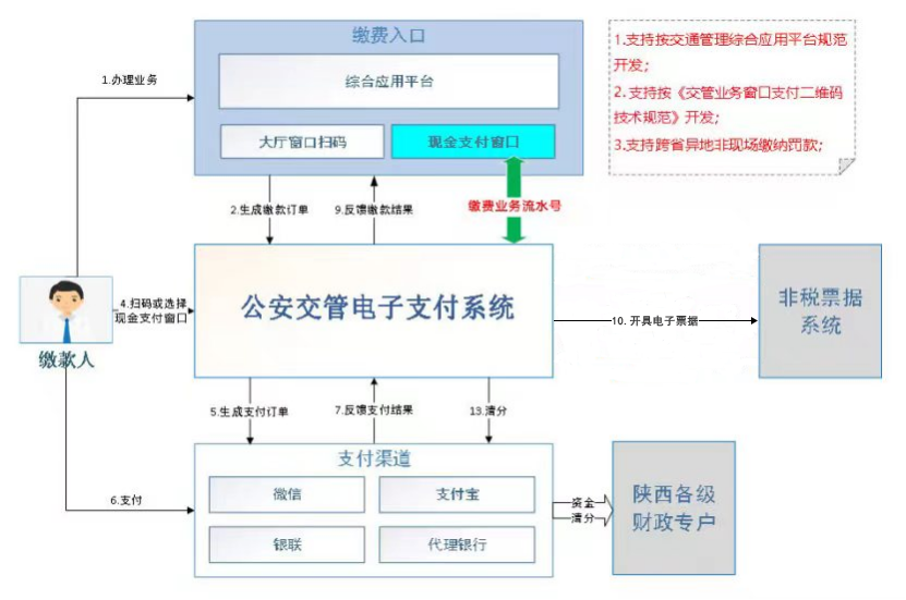 公安交通管理电子支付系统打通公安、财政相关系统,实现交警“综合应用平台”、财政非税票据系统财政适配器等互联互通;并集成微信、支付宝、银联等多支付渠道;本系统支持交警大厅窗口扫码缴费,支持跨省异地非现场处罚缴款,机动车异地受理本地出证;为缴款人提供多种缴费入口,多种缴款方式、多种支付渠道选择,使缴款更便捷和方便。